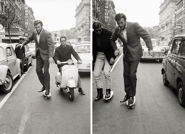 Clint Eastwood 1965 yılında Roma'da kaykaya binerken.